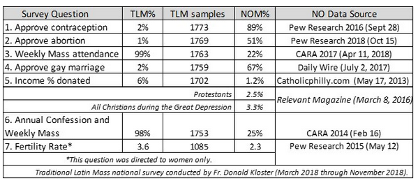 A sociedade moderna, segundo a crença popular, é a causa da diminuição da participação sacramental na Igreja Católica. No entanto, a presente pesquisa, comparada com outros dados, revela uma variação marcante entre os católicos que frequentam a Missa Tradicional (TLM) e aqueles que frequentam a Missa Nova (NOM). Essas diferenças são drásticas quando se comparam crenças, frequência à igreja, generosidade financeira e taxas de fertilidade.
